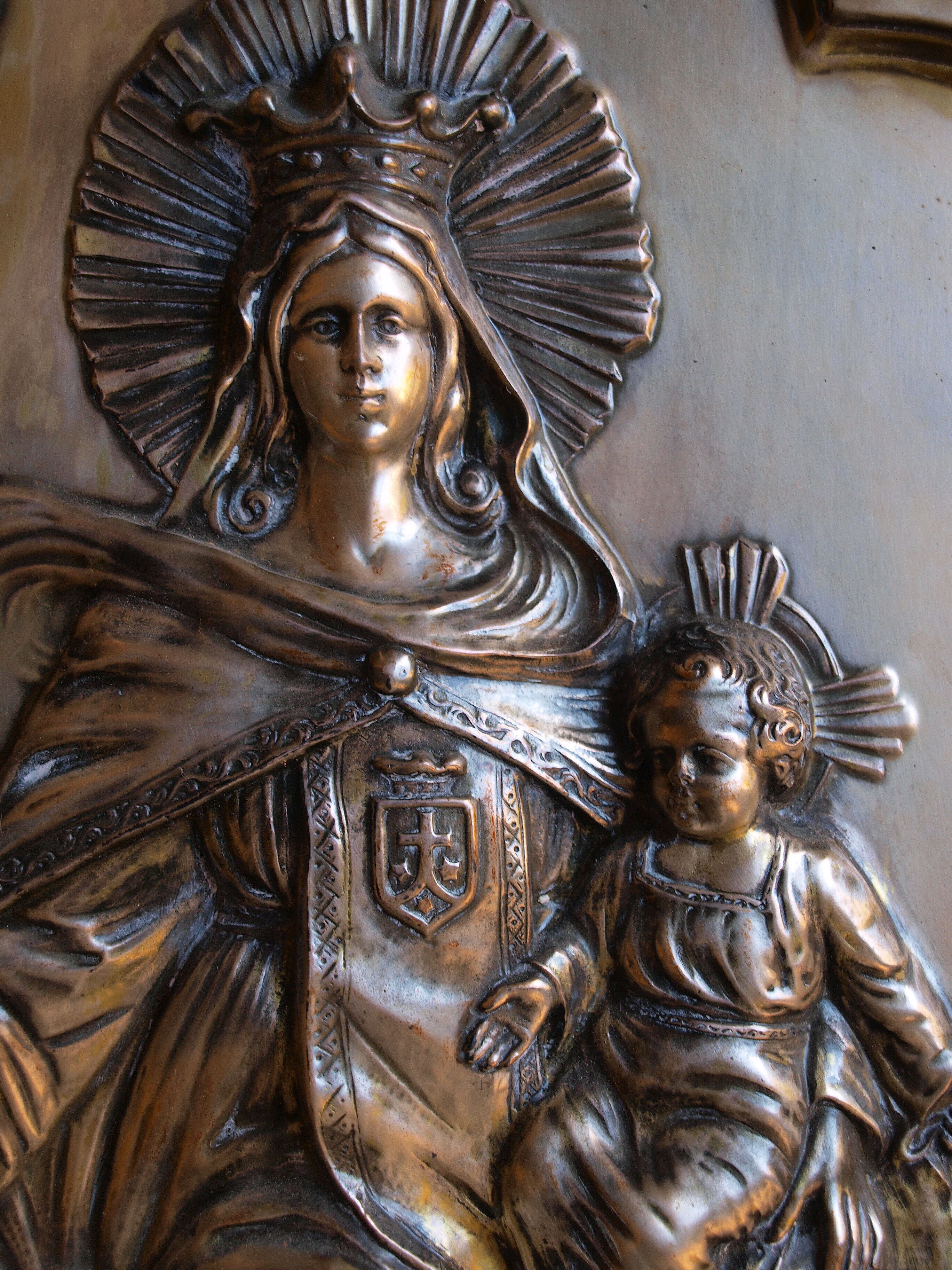 カルメル山の聖母 茶色のスカプラリオ 金属レリーフ イコン 聖人像 幼子と聖母 宗教彫刻 カトリック金属工芸 民藝 ヴィンテージ/H778
