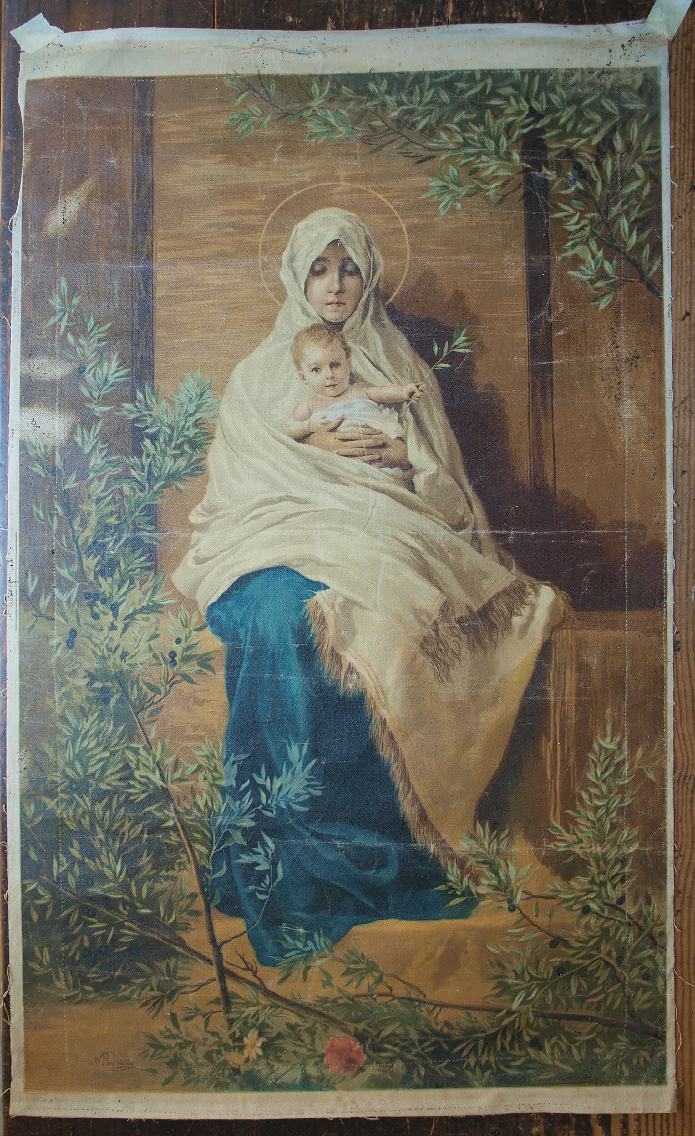 オリーブの聖母 タペストリ 聖母と幼いキリスト 51cm×84.5cm ニコロ・バラビーノ(1832年~1891) 宗教 1940年 古布 襤褸 テキスタイル アンティーク/J051