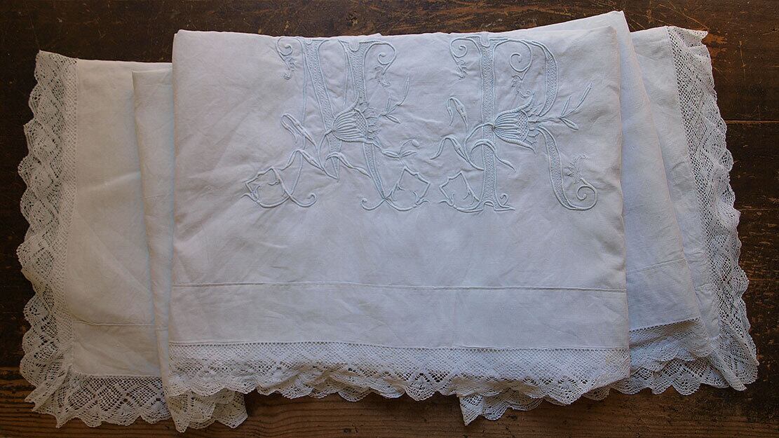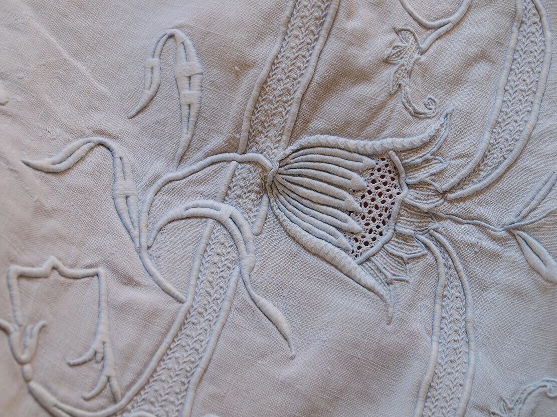 南欧のアンティーク市にて入手。1930年ぐらい。豪華な刺繍とボビンレースのベッドリネン。刺繍部分を表に折り返して使います。中央の大きな 刺繍は39cm×25cm、端から68cmまでニードルレース5.5cm有り。中央のイニシャル刺繍の右に小さな穴あります。他には特に目立つダメージはないと思います、写真でご確認いただけます。洗濯済、シーツとしてご利用頂けるアンティークです。古いものにご理解のある方のみご入札ください。参考資料、リメイクにもどうぞ。ファブリック、衣装、手芸関連を得意としております。他の商品も是非ご覧下さい。