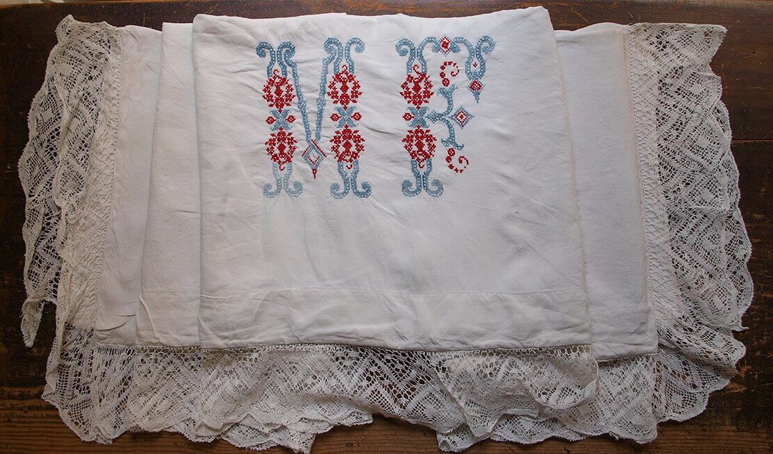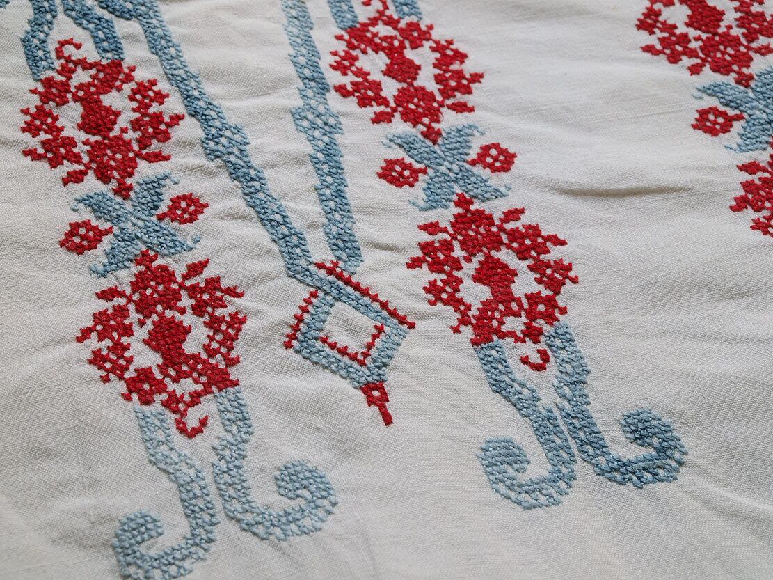 南欧のアンティーク市にて入手。1930年ぐらい。豪華な赤×青のクロス刺繍とボビンレースのベッドリネン。刺繍部分を表に折り返して使います。刺繍イニシャル27cm×18.5cm、ボビンレース幅11.5cm、端から71cmまでレース有り。。小さなシミがあります。他には特に目立つダメージはないと思います、写真でご確認いただけます。 洗濯済、シーツとしてご利用頂けるアンティークです。古いものにご理解のある方のみご入札ください。参考資料、リメイクにもどうぞ。ファブリック、衣装、手芸関連を得意としております。他の商品も是非ご覧下さい。