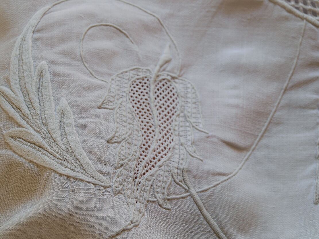 豪華婚礼用 イニシャル刺繍とスカラップ のシーツ 220cm×長275cm リネン ベッドリネン シャンブルリネン フランス アンティーク/J054