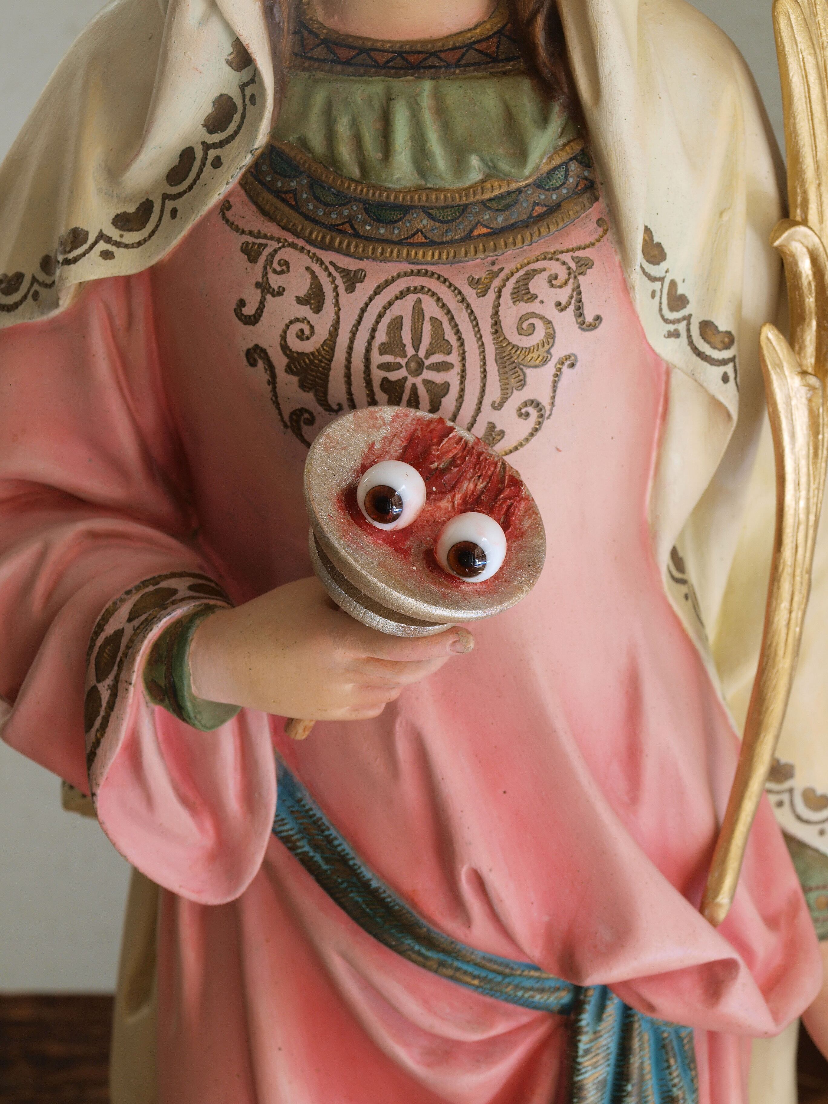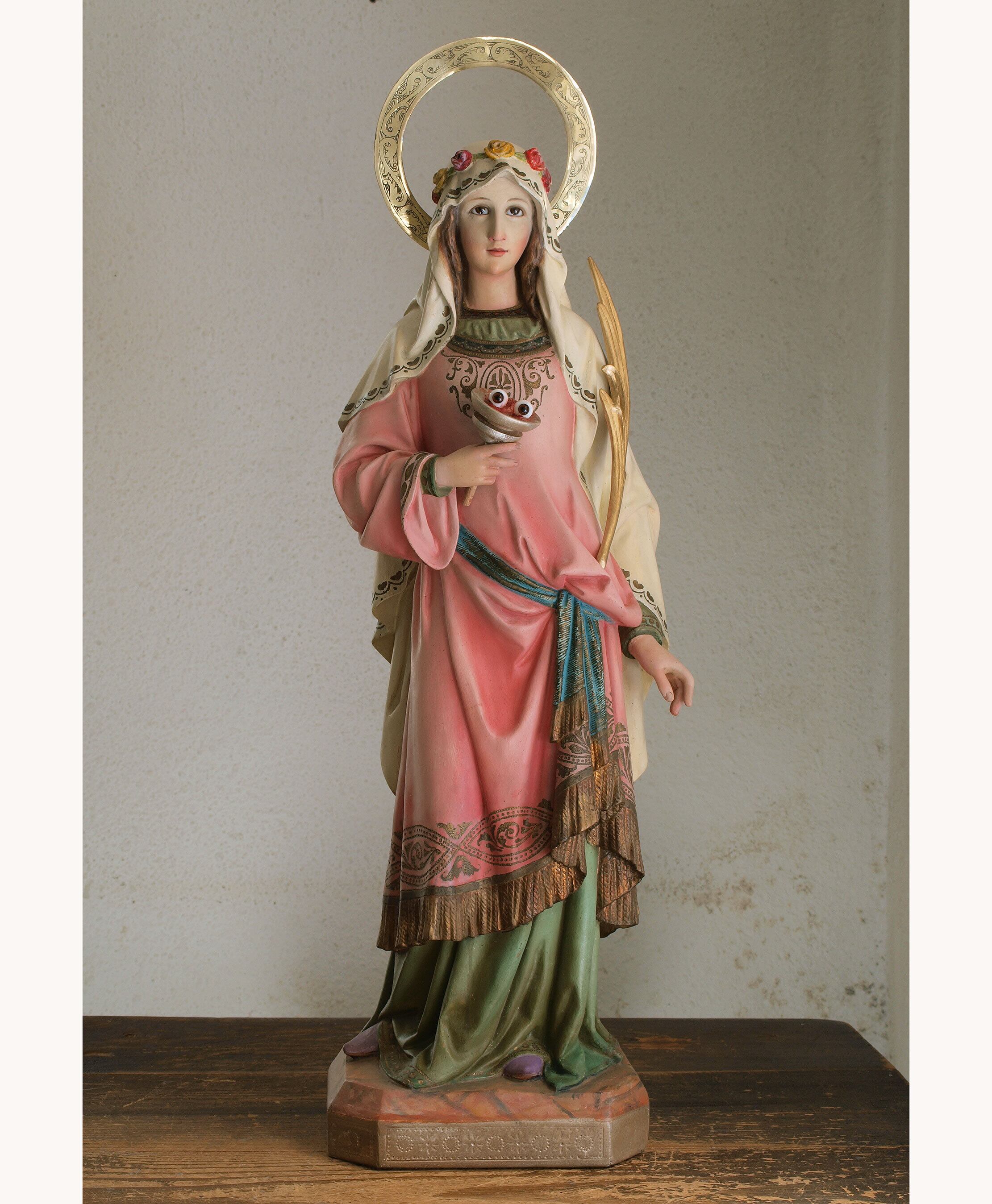 シラクサの聖ルチア おとめ殉教者 グラスアイ 68.5cm カトリック 聖人像 宗教彫刻 グラスアイ 民藝 宗教装飾 工芸 1930年 アンティーク/H984