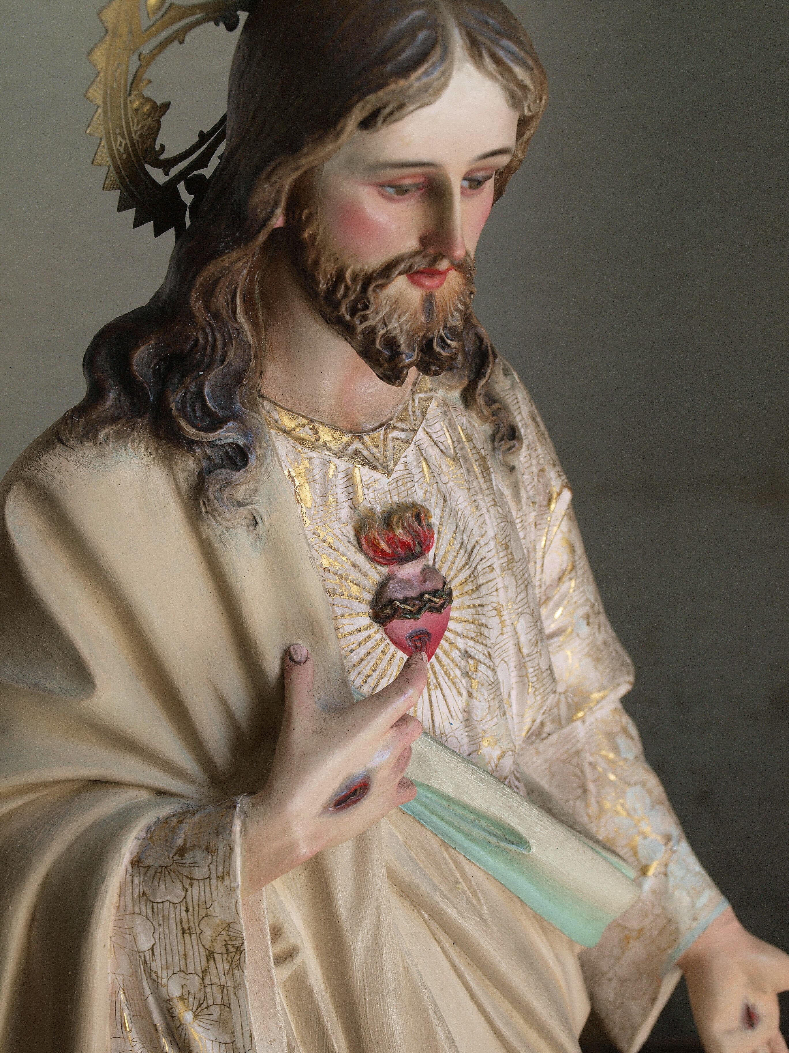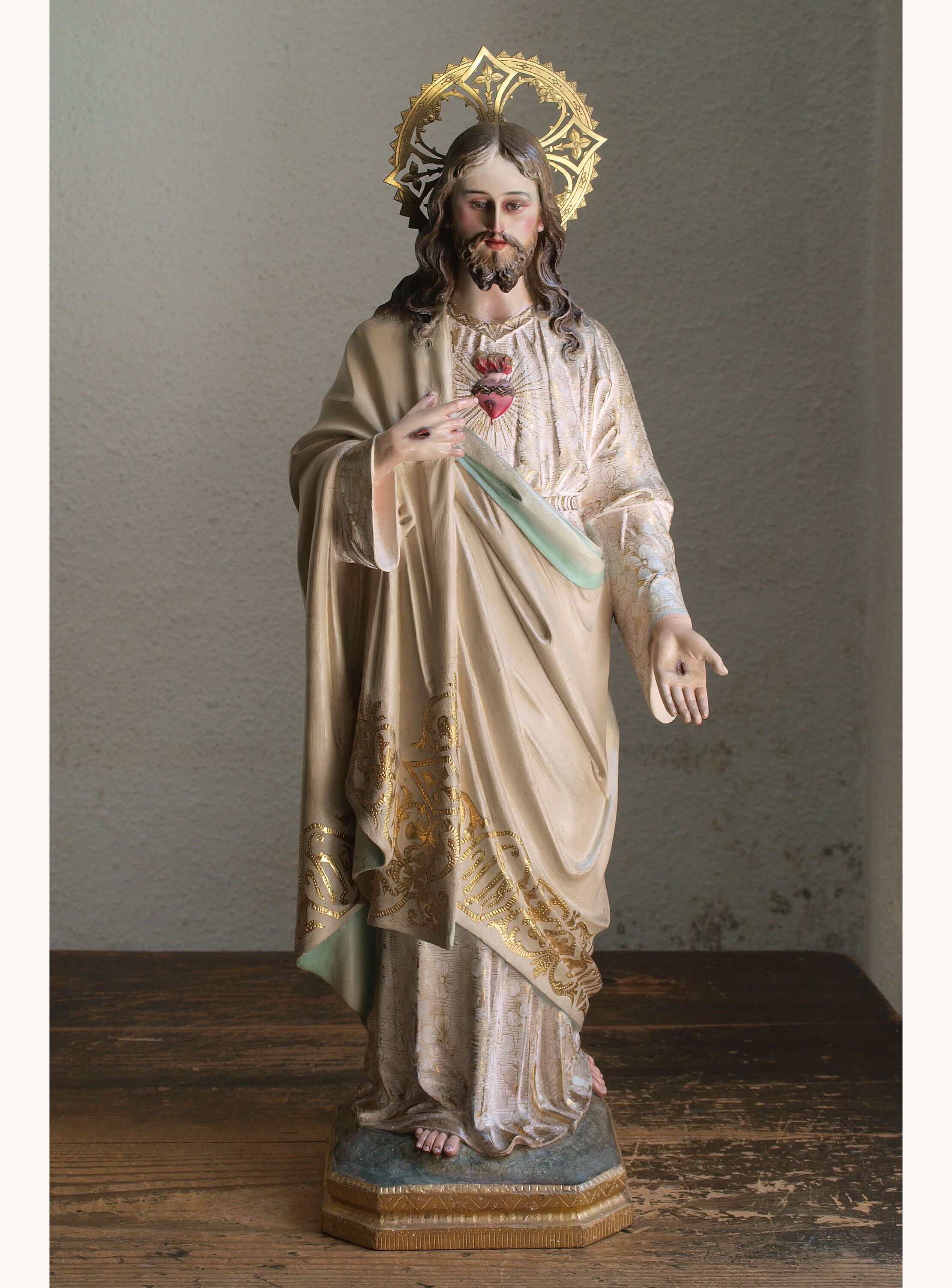 聖心のイエスキリスト 高55cm グラスアイ サクレクール 宗教彫刻 芸術 1930年 スペイン カトリック アンティーク/H999