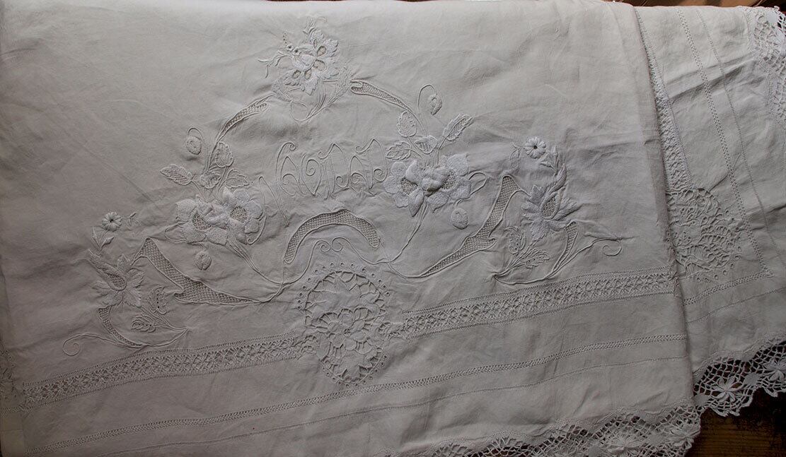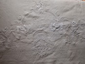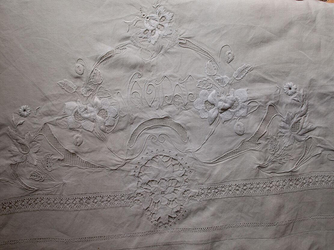 豪華婚礼用ニードルレースと刺繍レースのシーツ 巾230cm×長272cm+レース ベッドリネン ホワイトリネン シャンブルリネン フランス アンティーク/J131