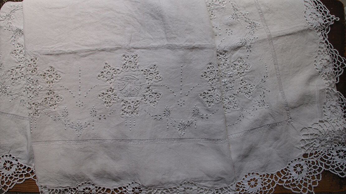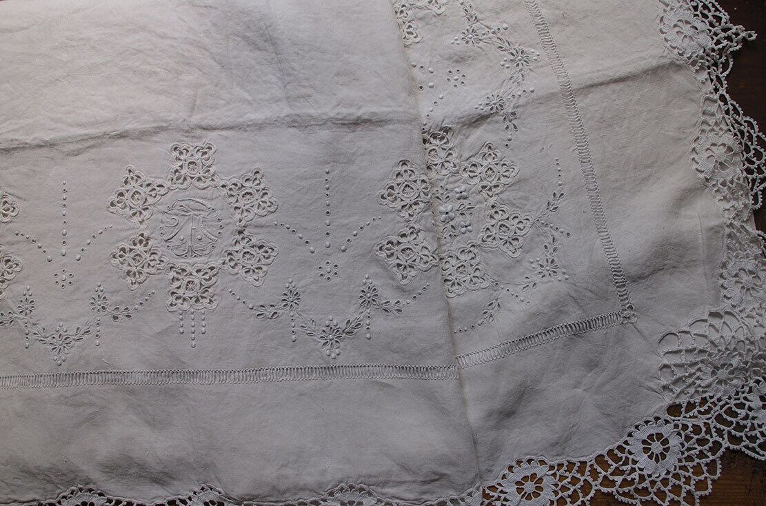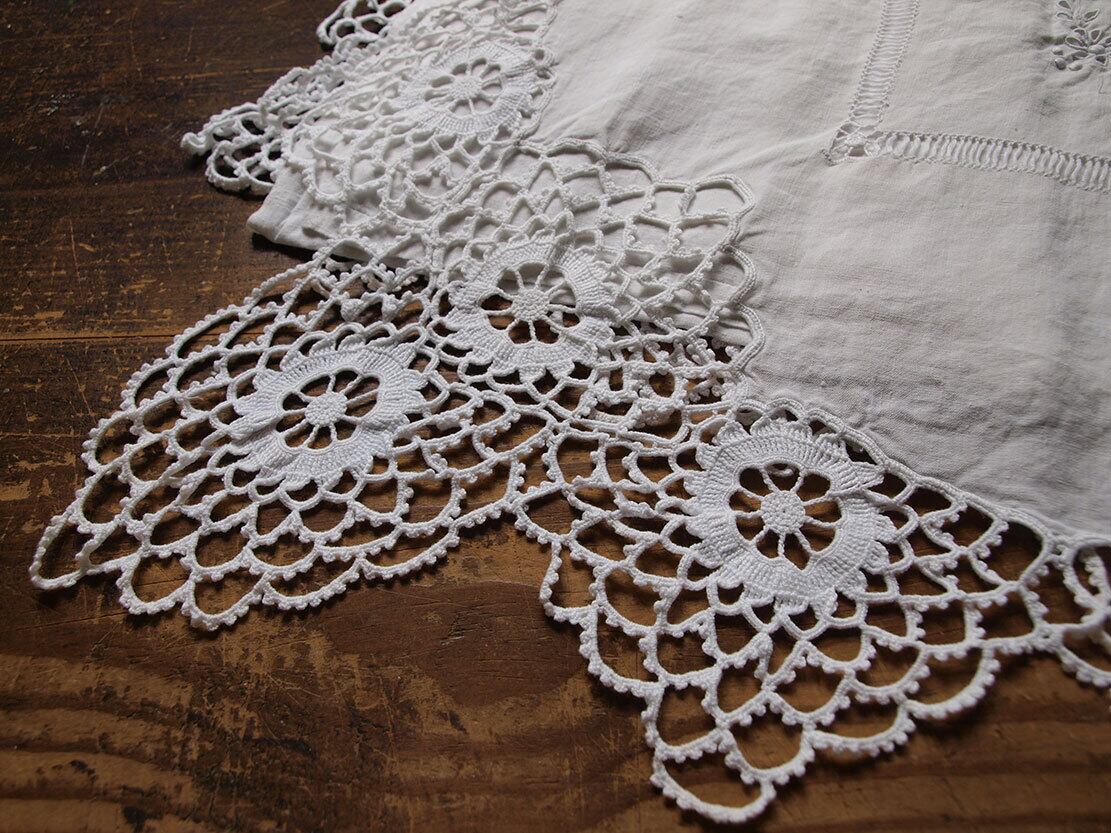 クロシェ レースと刺繍レースのシーツ 巾240cm×長275cm+レース ベッドリネン ホワイトリネン シャンブルリネン フランス アンティーク/J133