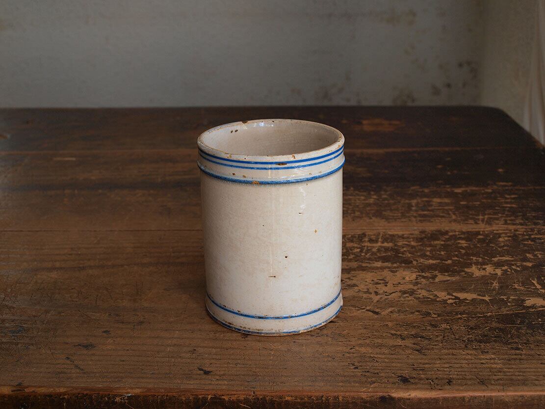 青い線のマニセス陶器のポット 19世紀 スペイン古陶 カップ 筒盃 ジャムポット ファーマシー デルフト アンティーク /J396