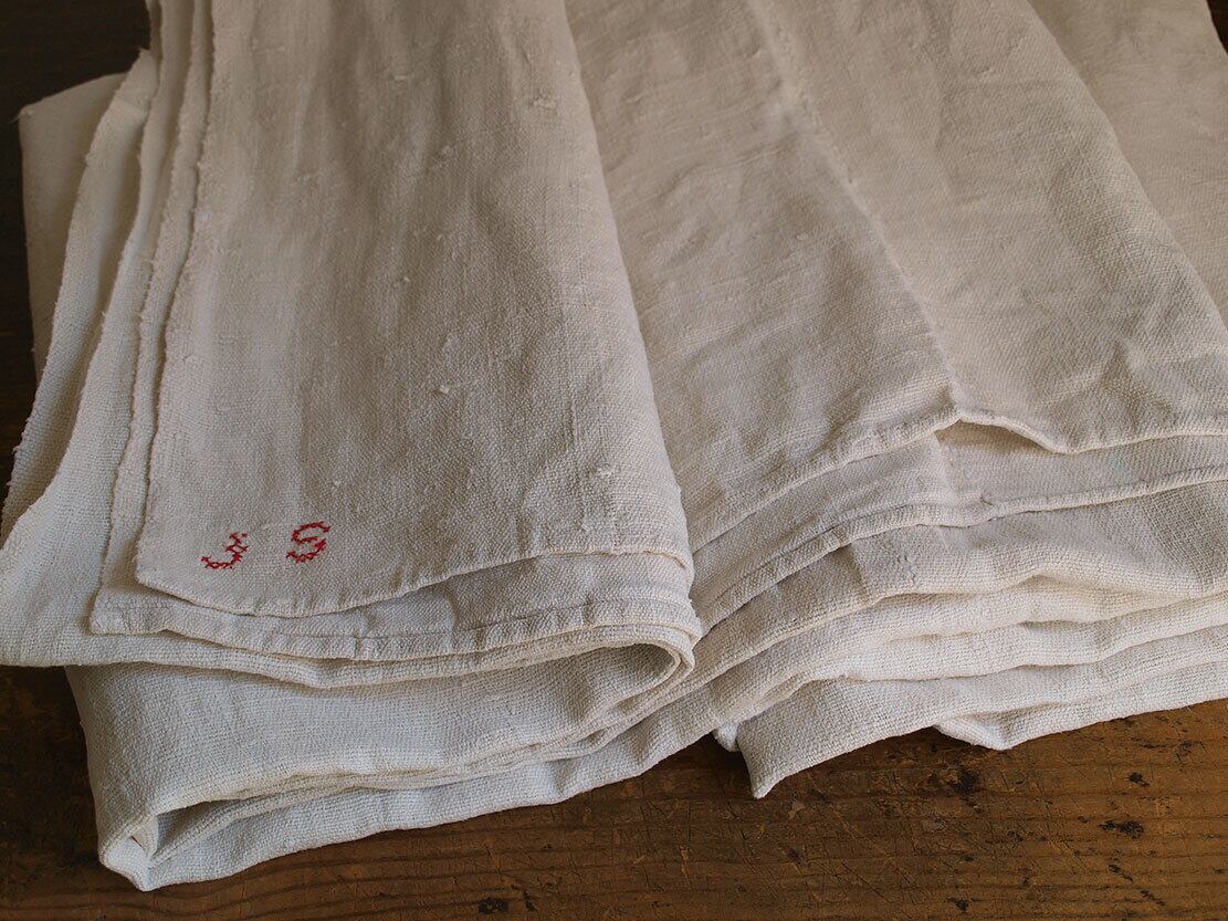 継ぎのあるシャンブルリネン 赤いクロス刺繍 巾132cm×長260cm イニシャル ホワイトリネン フランス アンティーク/J432