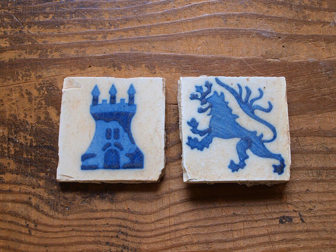 セビリア 旧市街 トリアナ地区の古いタイル 2枚 城と獅子 磁器タイル スペイン古陶 アンティーク /J470