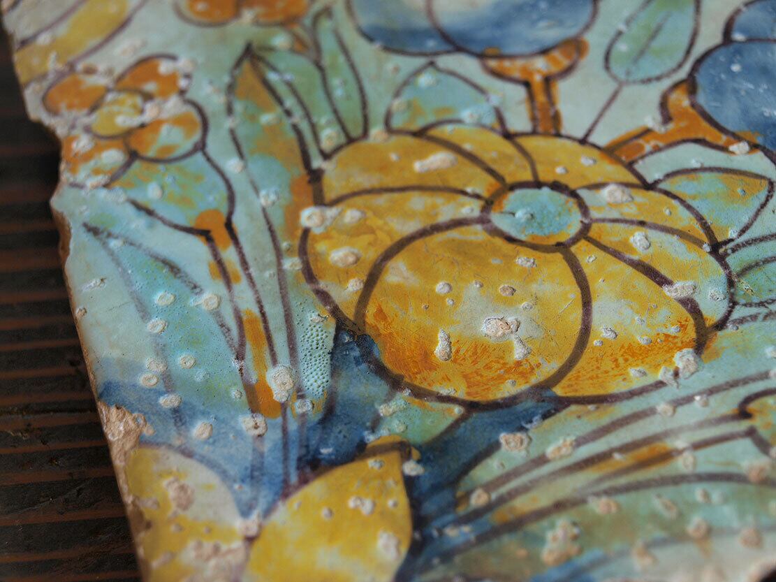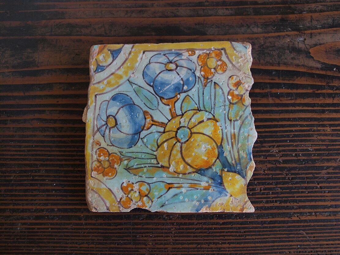 マニセス 18世紀 古いタイル スパニッシュマジョリカ 14cm×14cm スペイン古陶 工藝 民藝 アンティーク /J622