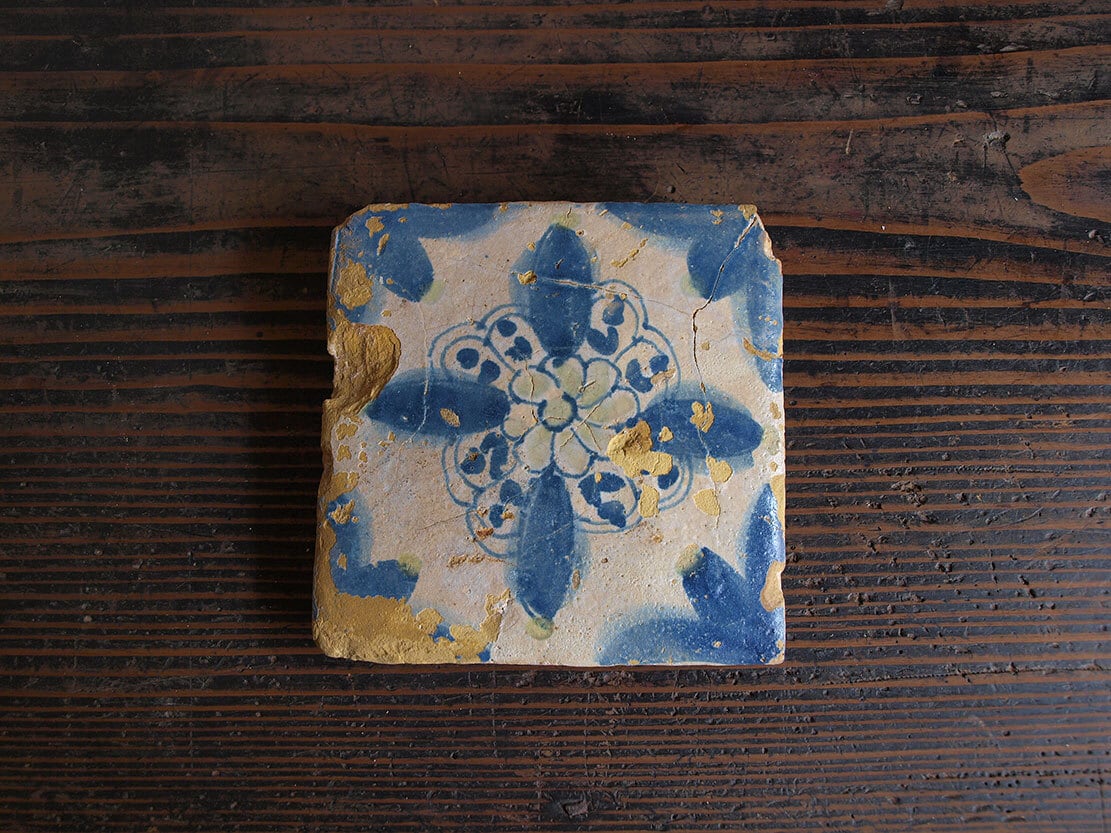 欧州のアンティーク市にて入手。15世紀、16世紀のゴシック・タイル。スペイン北東部サラゴサに位置するムエルで作られた物。ムエル陶器はイスラム芸術とカトリック、ゴシック、ルネッサンスの影響を受けていると言われています。ご覧のように亀裂があり、少しぐらつきます。釉薬のハゲ多数。断面が少し斜めになっているので自立は出来ません。時代を超えた古い物です、オブジェ 、リメイク、参考資料にも。