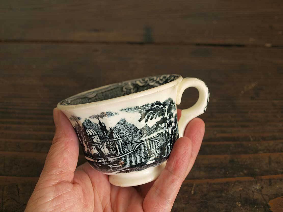 ヨーロッパの蚤の市で入手。ブラック・トランスファーウエァのカップ、19世紀。1841年創業、英国人のピックマンによってセビリアの修道院を利用して作られたスペインの古陶。1800年初頭に英国からの膨大な陶器製品のスペインへの輸入を禁止されたのち、スペイン国内で生産するために英国から多数のマイスターが派遣され指導したと言われています。街と橋のかかった川の紋様。多少の黄変、貫入、欠けなどあります。コレクション、実用にもいかがでしょう。
