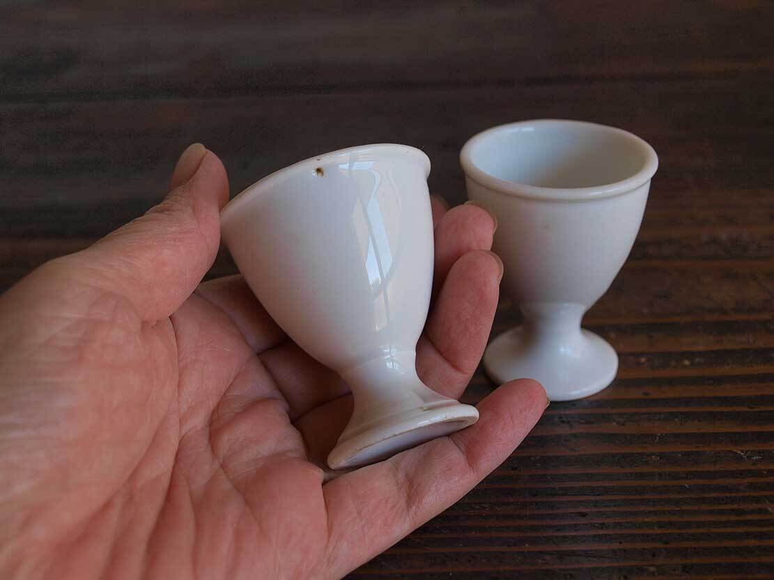 白い陶器のエッグスタンド2個 1920年代 スペイン古陶 白磁 カップ アンティーク ヴィンテージ /J831