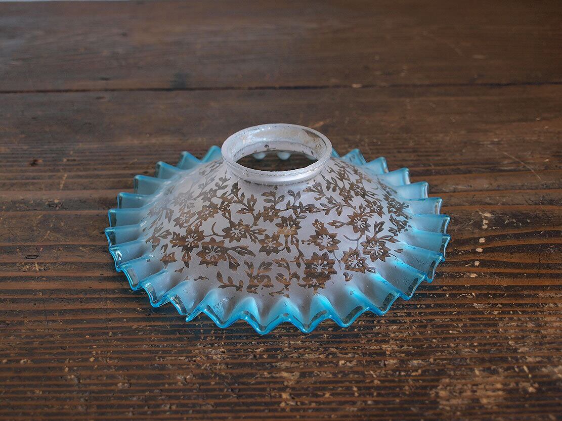 摺ガラスに花模様 水色フリルガラス ランプシェード電笠 直径18.5cm 大正ロマン ヨーロッパ フランスアンティーク/K020